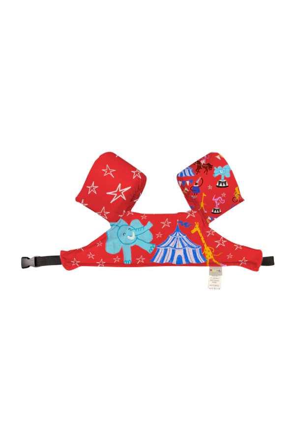 Fácil lavagem; Baixa absorção de umidade; Toque sedoso e secagem rápida. Confeccionado em tecido 100% Poliamida estampado, constituído de fibra sintética de alta resistência. Fecho de engate rápido em Nylon com alta resistência a tração. Preenchimento em espuma de polietileno expandido de alta flutuabilidade (não é inflável). Costura em linha 100% Poliéster com alta resistência a tração e agentes naturais.