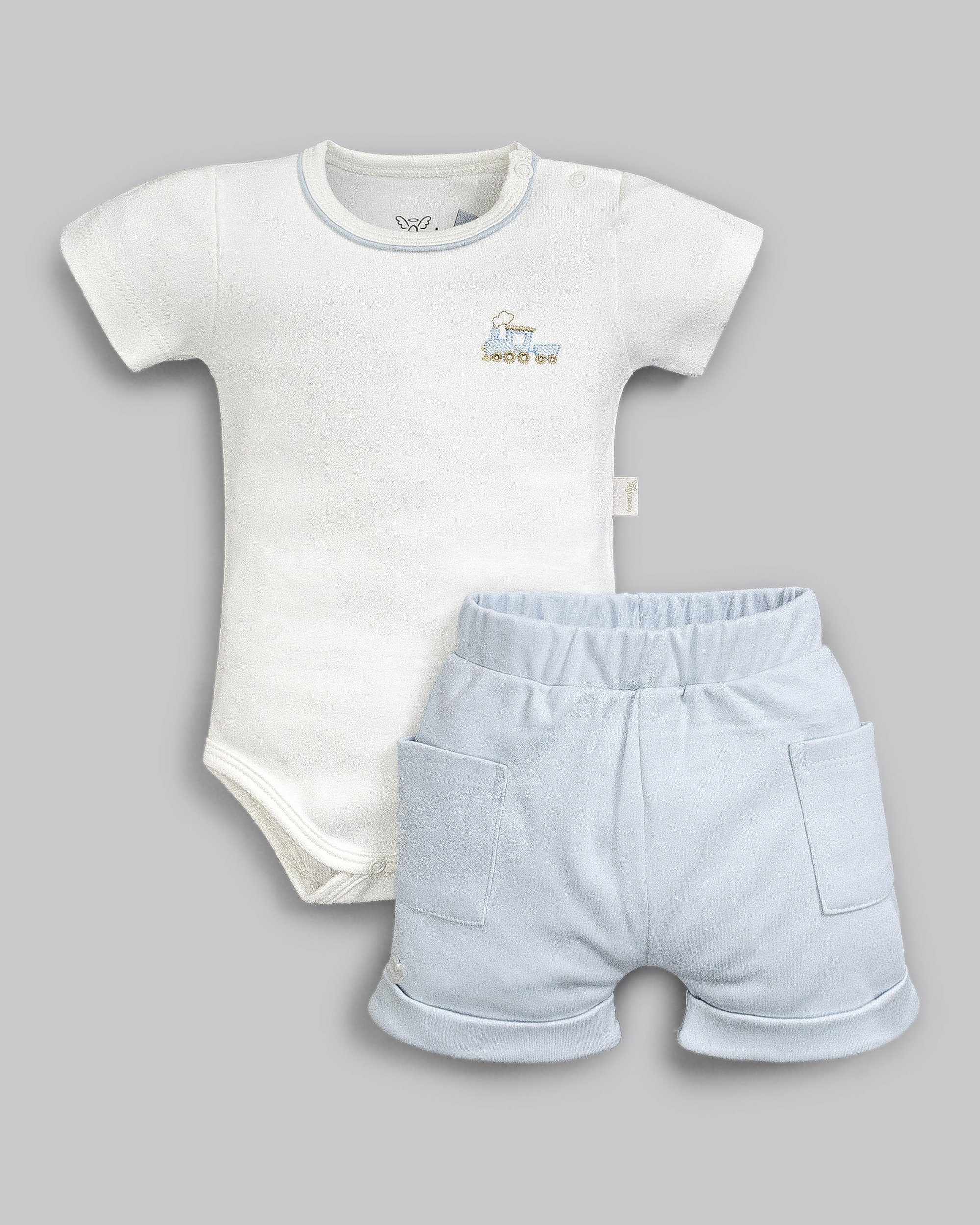 Conjunto Body e Short Suedine Pima Azul Transportes - Anjos Baby